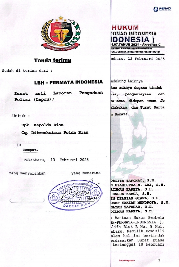 PEKANBARU, (Kanalkini) - Terkait Pengusiran Secara Paksa dan dengan dugaan Kekerasan, Penganiayaan Dan Pengrusakan Barang Secara Bersama-sama Didepan Umum Jo Mereka Yang Melakukan, Menyuruh Melakukan, Dan Turut Serta Melakukan Tindak Pidana Penganiayaan Berat. Berdasarkan surat kuasa para korban LBH-Permata Indonesia bersama Pralegel resmi buat laporan Ke Polda Riau, Cq. Ditreskrimum Polda Riau, tertanggal 13 Februari 2025.Adapun Kronologis Yang Diduga Dilakukan Oleh Para
