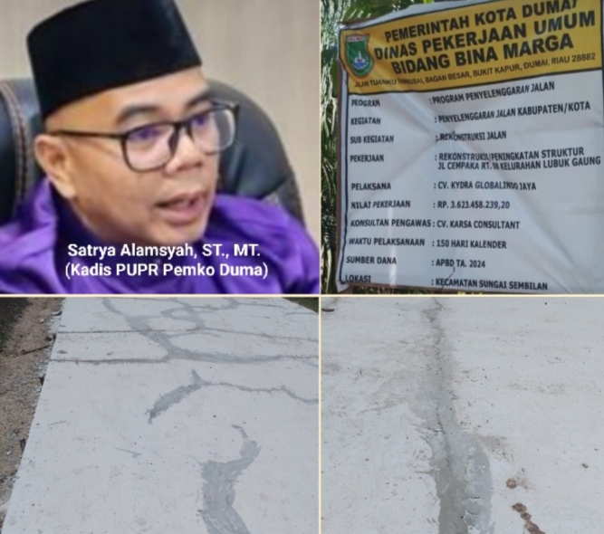 DUMAI, (Kanalkini.com) - Puluhan paket kegiatan Program Penyelenggara Jalan Kabupaten/Kota pekerjaan Rekontruksi / Peningkatan Struktur jalan, salah satu diantaranya peket pekerjaan yang berlokasi di Jln. Cempaka RT 08 Kelurahan Lubuk Gaung, Kecamatan Sungai Sembilan, Kota Dumai, Provinsi Riau dengan nilai pekerjaan Rp 3.620.458.239,20, yang baru hitungan Minggu alias seumur jagung namun sudah terlihat yang pecah dan retak-retak.Salah satu contoh hasil paket pekerjaan tersebut diatas. Dana yang