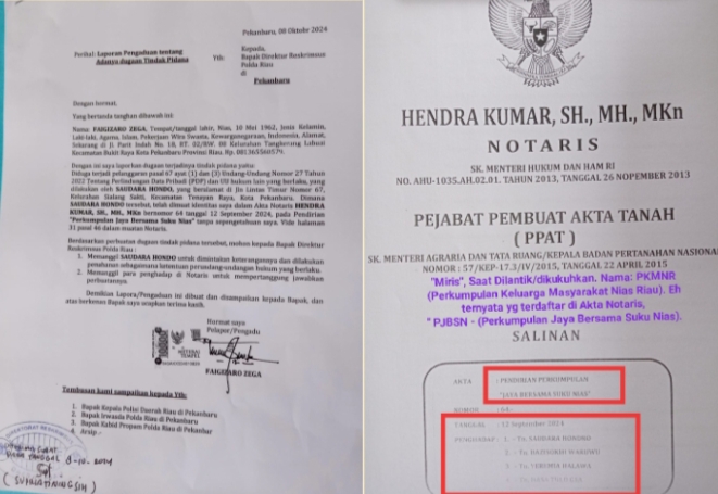 PEKANBARU, (Kanalkini.com) - Faigizaro Zega Warga Jalan Parit Indah Kota Pekanbaru resmi melaporkan Saudara Hondro ke Reserse Kriminal Khusus (Reskrimsus) Polda Riau terkait dugaan pencantuman namanya di dalam Akta Notaris Nomor : 64 tertanggal 12 September 2024, tanpa persetujuannya dan Cs.
