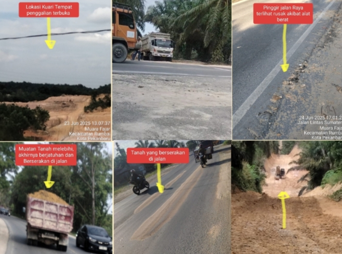 "Selain tanah bekas galian c berserakan dijalan, akibat dilewati alat berat beberapa titik jalan ditemukan kerusakan/retak, salah satunya di pintu masuk lokasi tempat penggalian terbuka di pasar senin Rt 001/Rw 004 Kelurahan Muara Fajar Barat, pembatas jalan dan pinggir aspal sudah rusak. Ucap Tehe saat di wawancara media di Pekanbaru. Selasa, 24/06/25.