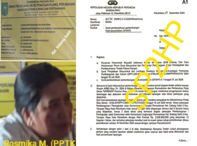 PEKANBARU, (Kanalkini.com) - Laporan LSM IPPH terkait dugaan tindak pidana korupsi pada proyek APBD Riau T.A 2024 di bidang Perumahan Kawasan Permukiman dan Pertanahan Dinas PUPRPKPP Prov Riau dengan PPTK Rosmika Manulang Pejabat Pelaksana Teknis Kegiatan, juga PPTK adalah pejabat pada Unit Satuan Kerja Perangkat Daerah (SKPD) yang melaksanakan 1 (satu) atau beberapa kegiatan dari suatu program sesuai dengan bidang tugasnya. Sebagaimana yang tertulis dalam SP2HP (Surat Pemberitahuan