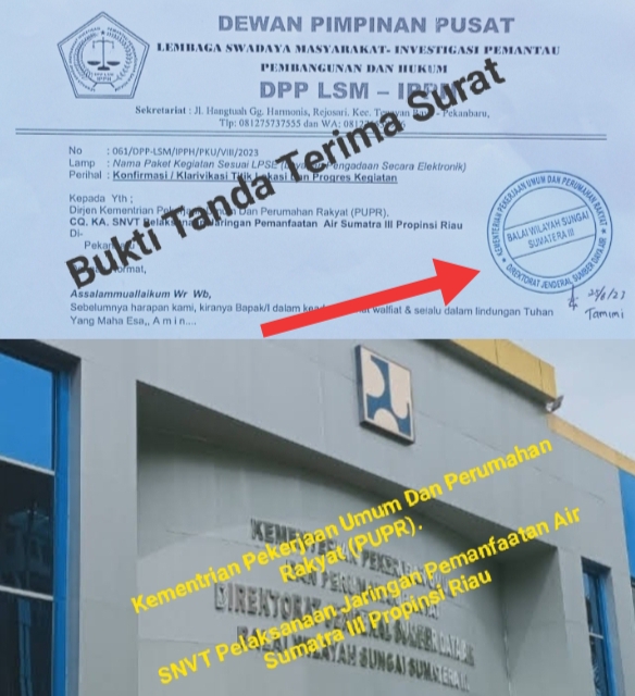 PEKANBARU, (Kanalkini.com) - DPP LSM-IPPH, (Dewan Pimpinan Pusat Lembaga Swadaya Masyarakat - Ivenstigasi Pemantau Pembangunan dan Hukum) bersama tim media, yang telah menyuratin Dirjen Kementrian Pekerjaan Umum Dan Perumahan Rakyat (PUPR), CQ. KA. SNVT Pelaksanaan Jaringan Pemanfaatan Air Sumatra III Propinsi Riau atau Balai Wilayah Sungai Sumatra III, yang beralamat di Jalan Pepaya dan Jln. Cut Nya Dien Kota pekanbaru Prov Riau. Untuk Konfirmasi / Klarivikasi terkait Titik Lokasi, Progres Kegiatan dan anggaran yang telah dibayarkan kepada rekanan/kontraktor, tertanggal 24/8/2023. Dengan nomor surat ; 061/DPP-LSM/IPPH/VIII/2023. Dan surat kita telah di terima oleh pihak SNVT (Satuan Non Vertikal Tertentu) Pelaksanaan Jaringan Pemanfaatan Air Sumatra III Propinsi Riau, tertanggal 25/08/23, yang bernama Tamimi dengan bukti tanda terima surat dan di stempel.