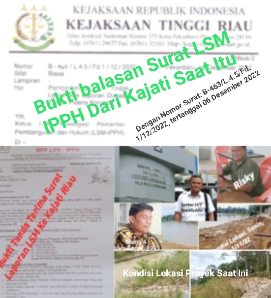 Tambah Rony, terkait persoalan tersebut diatas, LSM IPPH telah membuat laporan resmi ke kajati riau, dan telah di balas, dengan Nomor Surat: B-463/L.4.5/Fd.1/12/2022, tertanggal 06 Desember 2022. Dengan jawaban pada saat itu mengatakan, "bahwa surat laporan tersebut belum dapat di tindaklanjuti dan belum dilakukan pengumpulan data dan bahan keterangan lebih lanjut karena belum berakhirnya masa kontrak dan pemeliharaan".