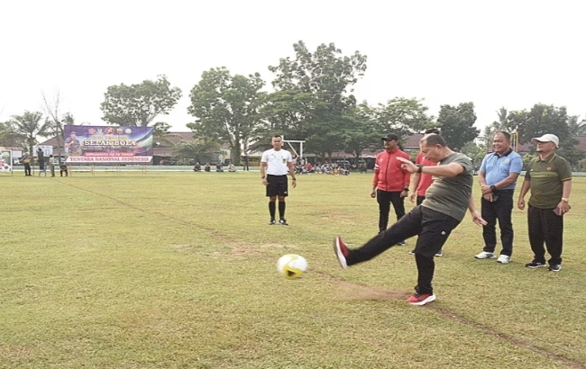 Danrem 031/WB Brigjen TNI Dany Rakca Andalasawan saat menendang bola perdana sebagai pembukaan turnamen sepak bola terbuka Korem 031/WB, Kamis (28/9/2023). |
