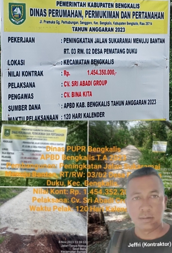 Salah satu paket kegiatan PUPR Kabupaten Bengkalis adalah Peningkatan Jalan Sukaramai Menuju Bantan tepatnya di Rt/Rw. 03/02, Desa Pematang Duku. Kec. Bengkalis dengan nilai Kontrak Rp. 1.434.352.202, kontraktor/rekanan pelaksana sesuai yang tercatat di papan plang proyek yakni Cv. Sri Abadi Group dan sebagai pengawas Cv. Bina Kita. Dana bersumber dari APBD Kab. Bengkalis T.A 2023.