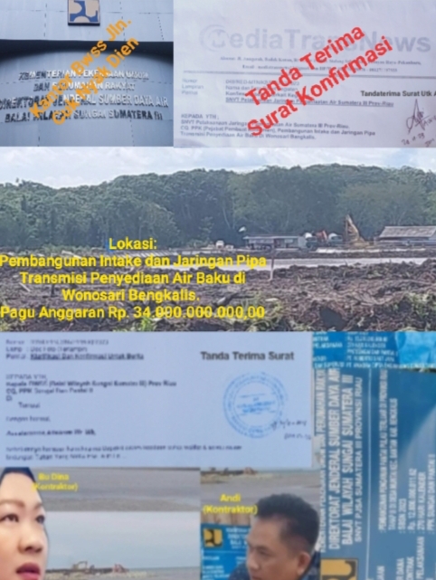 Tapi madia tidak berhenti sampai disitu saja, media ini lalu menyuratin BWSS pada tanggal 28 Nopember 2023 dengan nomor: 049/Red-Mtn/kb/Pku/XI/2023, untuk konfirmasi sebagaimana hasil dan temuan tim media dilapangan, dengan tujuan surat kepada Yth, SNVT Pelaksanaan Jaringan Pemanfaatan Air Sumatra III Prov Riau, Cq. PPK (Pejabat Pembuat Komitmen) Pembangunan Intake dan Jaringan Pipa Transmisi Penyediaan Air Baku yang berlokasi di Wonosari Kab. Bengkalis - Prov Riau. Surat konfirmasi diterima oleh Awie pada tanggal 29 Nop 2023 dengan di bumbuhi tandatangan pertanda surat telah di terima dinas yang bersangkutan. Namun setelah surat diterima sampai saat ini belum ada tanggapan dan respon dari dinas terkait.