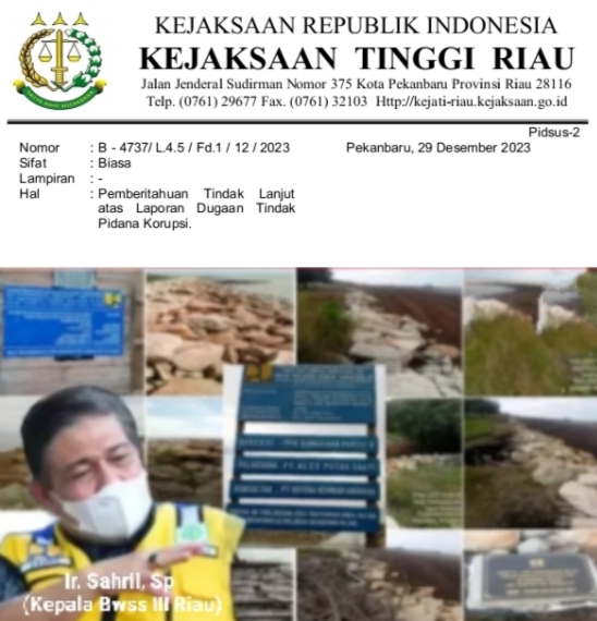 PEKANBARU, (Kanalkini.com) - Terkait Laporan DPP LSM IPPH (Investigasi Pemantau Pembangunan dan Hukum ). Dengan nomor surat: 027/LAP/DPP/LSM-IPPH/PKU/XII/2023, tertanggal 18 Desember 2023 Kepada Kejaksaan Tinggi Riau. Tentang adanya dugaan Indikasi Korupsi di Beberapa paket Bwss III Riau, yang berasal dari dana anggaran APBN Tahun 2021.