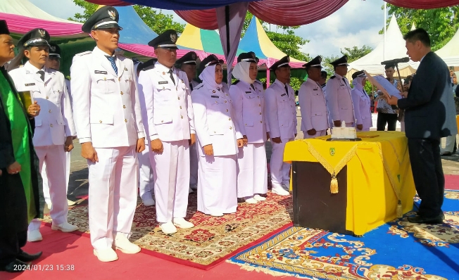 ROHIL, (Kanalkini.com) - Afrizal Sintong,S.IP,M.Si Bupati Rokan Hilir melantik 21 pejabat penghulu, 5 Orang pejabat administrator dan 2 orang kepala sekolah dilingkungan Pemerintah kabupaten Rokan Hilir di halaman Kantor Camat Tanah Putih Tanjung Melawan Rohil, Provinsi Riau. Selasa, 23/1/24.