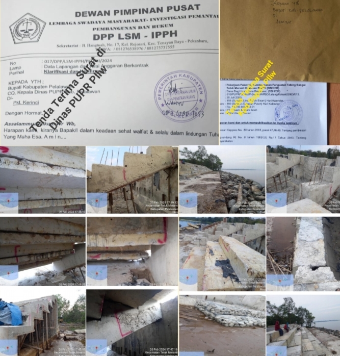 PEKANBARU, (Kanalkini.com) - Sebagaimana hasil invenstigasi dan temuan DPP LSM-IPPH, (Dewan Pimpinan Pusat Lembaga Swadaya Masyarakat - Ivenstigasi Pemantau Pembangunan dan Hukum) bersama LSM LGS (Lembaga Garuda Sakti) DPW Riau dilapangan bersama Tim Media pada 26 Februari 2024. Melalui surat klarifikasi dan konfirmasi Tim menyuratin Bupati Kab. Pelalawan, CQ. Kapala Dinas PUPR Kab. Pelalawan, untuk memberikan klarifikasi tertanggal 4 Maret dengan nomor surat 017/DPP/LSM-IPPH/PKU/III/2024.
