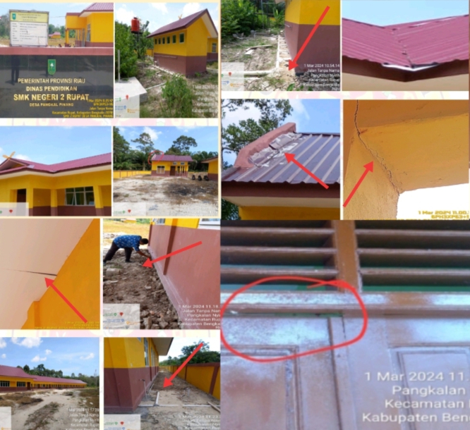 Juga ada beberapa item atau persoalan ditemukan pada pembangunan sekolah SMK N 2 Rupat tersebut, seperti dinding bangunan baru yang belum sampai satu tahun sudah pada retak-retak, sesuai, pengerjaan seng atap bangunan dilaksanakan. asal-asalan, konsen dan pintu sepertinya tidak sesuai dengan bahan kayu yang tertera di RAB dan sehingga daun pintu terpasang tidak rapat dan renggang, pengerjaan toilet pada paralon/pipa tidak ditutupi sebagaimana sebagaimana biasanya untuk pengaman agar tidak mudah rusak (pecah),