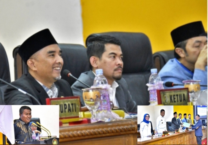 Bupati Kampar, Ahmad Yuzar S,Sos MT, dan Wakil Bupati Kampar Dr Misharti S,Ag M,Si menghadiri Rapat Paripurna DPRD Kabupaten Kampar dalam rangka Penyampaian Laporan Keterangan Pertanggungjawaban (LKPJ) Kepala Daerah Tahun Anggaran 2024 dengan agenda mendengarkan laporan dari fraksi - fraksi di DPRD Kampar. Kegiatan ini digelar di Ruang Rapat Paripurna DPRD Kabupaten Kampar. Rabu, 9/4/25.