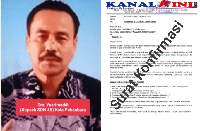 Adanya informasi dari berbagai narasumber, maka untuk memenuhi kaidah dalam pemberitaan media yang berimbang, maka media www.kanalkini.com, mengajukan konfirmasi dan Klarifikasi tertulis, terkait pungutan biaya baju siswa/i T.A (Tahun Ajaran) 2025 di SDN 45 Kota Pekanbaru-Riau. Pada Senin, 25/08/25. Dengan nomor 023/Pimred/KKc/VIII/PKU/2025. Dan surat konfirmasi telah di kirim lewat WhatsApp Kepsek Drs. Yasrimeddi (Kepsek), dengan nomor +62 821-4771-1xxx.