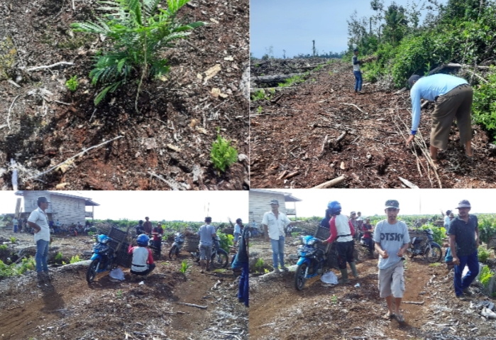 BENGKALIS, (Kanalkini.com) - Untuk mencegah perambahan dan deforestasi hutan lebih luas di Desa Sungai Linau kecamatan Siak Kecil, Kabupaten Bengkalis dengan mengendarai sepeda motor sekitar 50 orang masyarakat Sungai Linau untuk ke tiga kalinya melakukan pemulihan hutan dengan cara menanami kembali lahan pembukaan baru dengan berbagai tanaman kehutanan, kali ini mereka di dampingi oleh Kepala pemangku Hutan ( KPH) Bengkalis yang dipimpin oleh KKPH Bengkalis Agus Rianto dan robongan meninjau lokasi land clearing penanaman Sawit yang diduga tanpa izin di hutan produks yang merupakan wilayah Gambut Lindung Desa mereka. Masyarakat kembali membawa ratusan batang pohon karet untuk ditanami di areal sawit tersebut karena mereka tidak ingin kampungnya dilanda bencana banjir dan kekeringan akibat perambahan hutan dan alih fungsi lahan menjadi perkebunan kelapa sawit yg dilakukan oleh org diluar desa Sungai Linau. Jumat, 17/9/21.