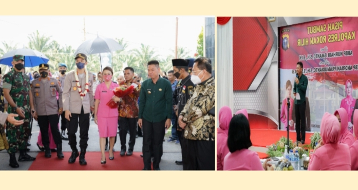 ROHIL, (Kanalkini.com) - Polres Rokan Hilir (Rohil) menggelar pisah sambut Kapolres baru, AKBP Andrian Pramudianto menggantikan Kapolres sebelumnya, AKBP Nurhadi Ismanto di Kantor Polres Rohil, Ujung Tanjung. Pisah sambut dilaksanakan setelah Kapolda Riau, Irjen Mohammad Iqbal memimpin serah terima jabatan pada Jumat, pekan lalu. Kedatangan Kapolres Andrian Pramudianto disambut oleh Bupati Rohil Afrizal Sintong, Kapolres Nurhadi Ismanto, Dandim 0321 M. Erfani, beberapa Forkopimda serta tokoh masyarakat Rohil lainnya, Senin (18/7/2022).