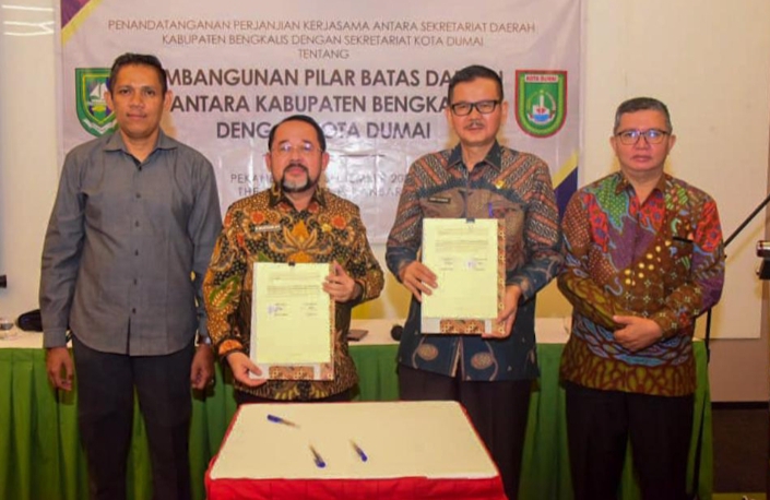 Penandatanganan kerjasama antara Sekretariat Daerah Kabupaten Bengkalis bersama Sekretariat Pemko Dumai ini disaksikan Sekretaris Daerah Provinsi Riau yang diwakili Fungsional Sub Koordinator Perbatasan Ismail.