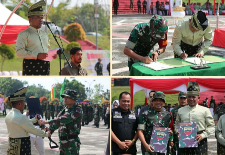 Di akhir upacara pembukaan TMMD ke-115 tahun 2022 di wilayah kabupaten Pelalawan dilaksanakan penandatanganan naskah dan penyerahan program TMMD dari Kepala daerah kepada Dansatgas TMMD ke- 115 serta sesi foto bersama (Red) ***