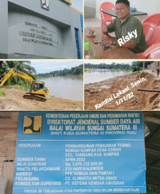 Salah satunya dari dana APBN tersebut dialokasikan pada Pembangunan Pengaman Tebing Sungai Kampar yang berlokasi di Desa Gobah, Kec.Tambang, Kab.Kampar. Dengan pagu anggran 5 miliar. Yang wajib dilaksanakan oleh pemanang tender Rp. 3.676.122.800.00, atau dengan penawaran (73,52 %) dari pagu anggaran, yang dimenangkan oleh Cv. Alimarta Mitra Abadi yang dikendalikan oleh Risky yang diduga orang luar dari Cv Alimarta Mitra Abadi. Konsultan PT. Refana Kembar Anugrah, yang beralamat di Jl.Tanjung Indah Blok B No.55 Lapai-Padang (Kota) Sumbar. PPK Sungai dan Pantai I, dengan PPK (Mario A Simanjuntak, ST).