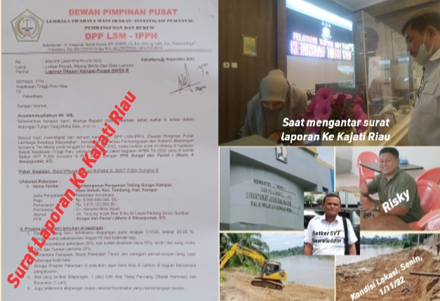 PEKANBARU, (Kanalkini.com) - LSM resmi laporkan kegiatan Proyek BWSS ke Kejaksaan Tinggi Riau. Pada hari selasa tanggal, 15/11/22. Dengan nomor surat No. 009/DPP-LSM/IPPH/PKU/XI/2022, terkait proyek yang Pembangunan Pengaman Tebing Sungai Kampar yang berlokasi di Desa Gobah, Kec.Tambang, Kab.Kampar. Proyek bersumber dari dana APBN (Anggaran Pendapatan Belanja Negara) Tahun 2022, yang disalurkan melalui Kementerian Pekerjaan Umum dan Perumahan Rakyat, Direktorat Jenderal Sumber Daya Air, Di Balai Wilayah Sungai Sumatra III.
