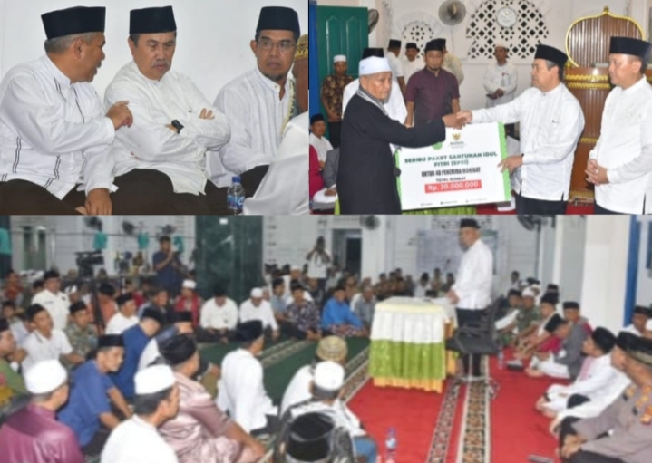 Selanjutnya pada malam penuh berkah ini, Gubernur Riau bersama rombongan menyerahkan bantuan untuk masjid Al-ma’arif melalui CSR Bank Riau Syari’ah sebesar Rp 50 juta, kemudian 1000 paket santunan idul fitri Rp 20 juta untuk 40 penerima serta bantuan JKM Rp 42 juta untuk ahli waris Rindi Indriani.