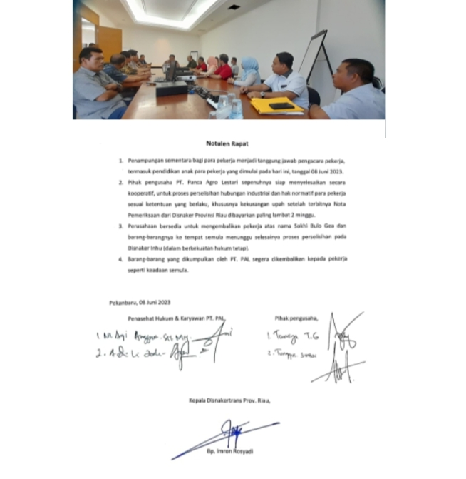 Adapun Notulen hasil kesepakatan pada pertemuan, antara pihak Disnaker Provinsi Riau yang dihadiri langsung oleh Imron Rosyadi, Kepala Disnakertrans Prov. Riau dengan didampingi beberapa staf Disnakertrans, dari PT. PAL yang di wakili, oleh Tovariga T Giting dan Tunggul Sianturi juga kuasa hukum pekerja/buruh pada kantor advokat dan konsultan hukum Merrya Pamadya Utaya S.H., CPCLE., M. Agi Anggara, S.H., M.H dan Adili Zalukhu kuasa hukum pekerja, bertempat dikantor PT. Panca Agro Lestari, ( Group Duta Palma), Jln. Sudirman, belakang MTQ Kota Pekanbaru. Kamis, 8 Juni 2023.
